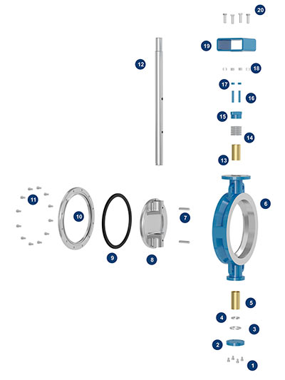 2、防靜電:由于閥座采用聚四氟乙烯等非金屬材料,致使蝶板與閥座在啟閉過程中會產生靜電,靜電積累會產生安全隱患,在結構上采用限位套結構將蝶板上的靜電通過限位套傳遞到閥體上,同時在閥體上設置防靜電螺栓與地面接觸,從而達到消除靜電積累的目的。