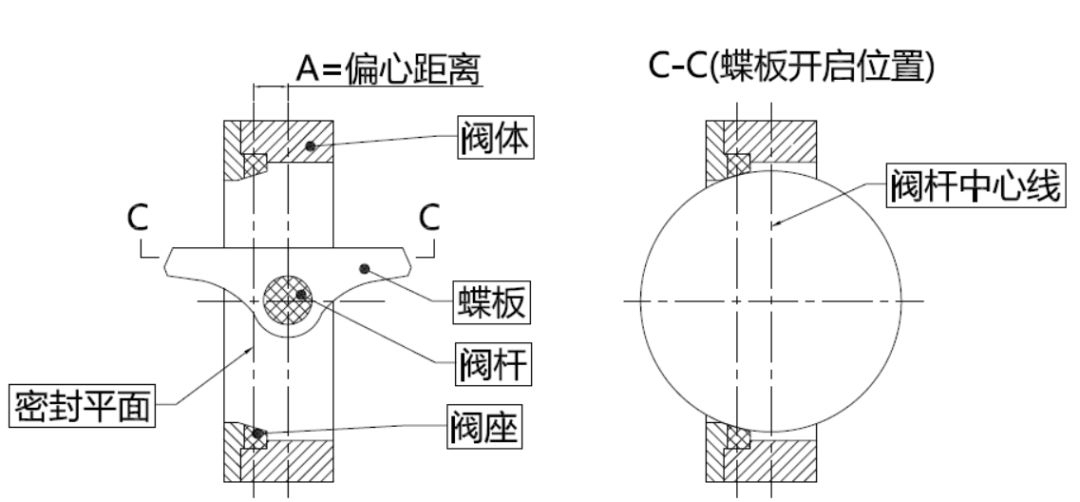 蝶板的閥桿中心與蝶板密封截面按A偏心設(shè)計(jì),蝶閥在開啟過程中,蝶板密封面逐漸脫離閥座密封面;
